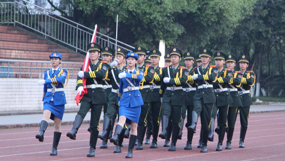 升国旗仪式上,主持人宣布升旗仪式开始,英姿飒爽的荣昌校区女子国旗班出旗,伴随着庄严的五星红旗冉冉升起,全体师生行注目礼,奏唱中华人民共和国国歌。