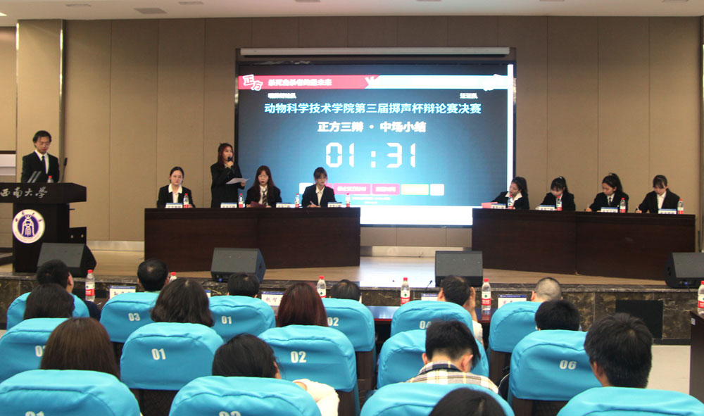 4月14日晚,学院在荣昌校区2211报告厅举行第三届“掷声杯”大学生辩论赛决赛。学院党委书记赵智华,党委副书记、纪委书记文武,副院长向钊,团委书记、学工办主任孙海军,工会主席章杰、办公室主任周勤飞、教务办主任李凤翔、组织员贺春湘、各年级辅导员及200余名学生代表到场观看比赛。比赛邀请商贸学院、动物医学院、水产学院的学生辩论队负责人作为比赛评委。