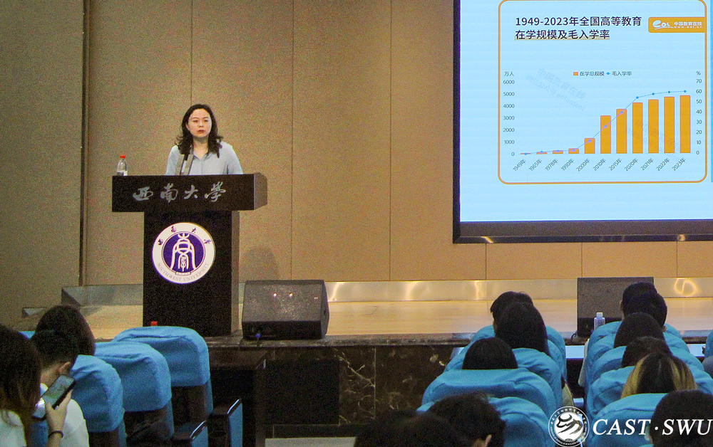 首先,学院党委副书记、纪委书记兰英做就业形势介绍。兰书记围绕什么是就业、为什么要就业以及怎样就业三个主题,从就业形势认识、就业去向选择、职业理想实现三个方面展开,希望同学们加强自我认知,充分认识自我性格、兴趣、能力和价值观等方面的认识,选择适合自己的岗位实现人岗匹配。兰书记强调希望同学们在充分认识自我的基础上找准定位,正确选择、坚持选择、实现选择,踏踏实实实现人生理想。