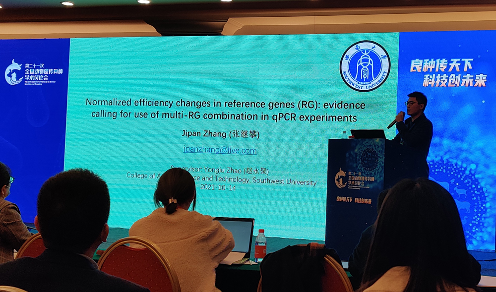 赵永聚教授课题组博士生张继攀做了题为《Normalized efficiency changes in reference genes (RG): evidence calling for use of multi-RG combination in qPCR experiments》的报告,并获第七届“吴常信动物遗传育种奖励专项基金”优秀论文奖,此外还获得了大会首次设立的“青年学者学术旅行激励计划”奖。