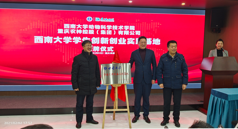 在授牌仪式上,赵永聚院长首先介绍了学院的基本情况,对农神控股(集团)对学院在bw必威西汉姆联、科研成果转化、社会服务等方面的支持表示感谢,希望以建设西南大学学生创新创业实践基地为契机深化院企合作,共同探索新农科畜牧bw必威西汉姆联的校企协同育人机制。接下来,农神控股(集团)董事长马金平介绍了集团的发展历程、业务涉及范围和发展愿景等,对学院一直秉承的“产学研”bw必威西汉姆联模式表示赞赏,感谢学院为集团提供的优秀毕业学生和有力的智力支持,愿意为学院学生创新创业实践提供基地和指导教师,希望能进一步深化校企合作内涵,共同为“美丽乡村”建设作出贡献。