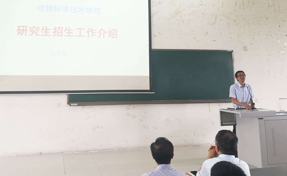 随后,赵中权做了考研、保研培训指导。他首先介绍了本科推免研究生的条件要求、报名程序、资格审查和录取接收等内容。紧接着以动物科学专业学生考研为例,从学院基本情况、学科平台、团队建设及研究生招生等四个方面以长者、导师、领导的身份进行语重心长的亲切交流,就考研院校、学科方向、学业导师选择等方面给出建议,从学院硕士研究生招生录取角度给学生详细讲解了统考硕士研究生招生流程及注意事项。