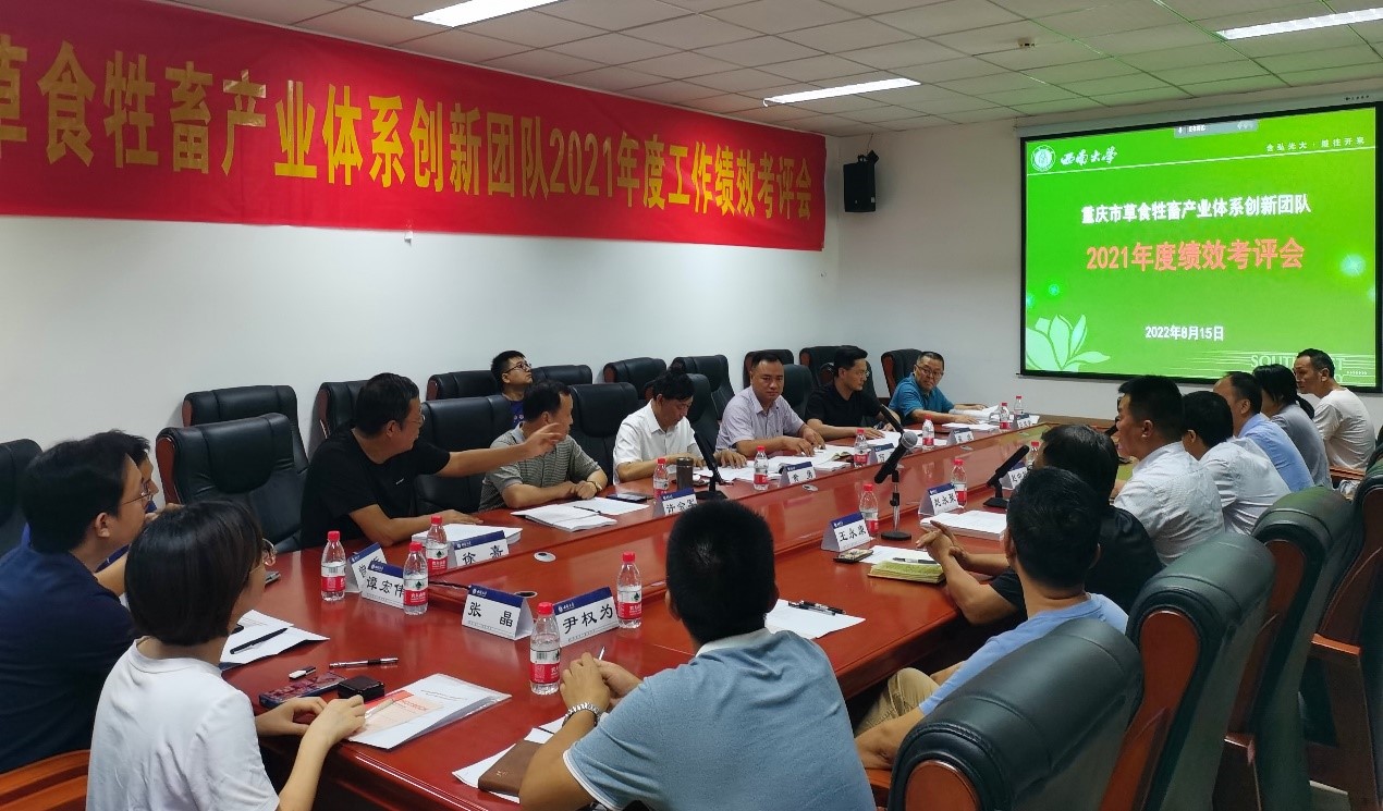 为考评重庆市草食牲畜产业体系创新团队2021年工作,2022年8月14-15日,重庆市农业农村委组织专家对产业体系创新团队2021年度工作进行工作绩效考评,市农业农村委相关处室领导、考评组领导和专家、体系首席专家、各功能研究室岗位专家、各综合试验站站长、首席办公室成员参加了会议。会议在我院219会议室举行,由市农业农村委科教处徐嘉同志主持。