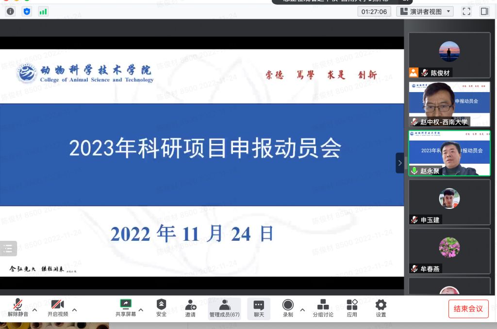11月25日下午,学院通过线上方式召开2023年科研项目申报动员会。学院党委书记赵智华、院长赵永聚、副院长周克勇及全体专任教师参加会议,会议由副院长赵中权主持。
