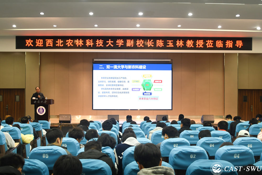 报告中,陈玉林副校长以我国高等教育学科专业体系为切入点,深入解读“双一流”建设、新农科建设及高等教育“四新”建设等国家战略背景下的核心内涵。他结合西北农林科技大学“1+N”培养模式、第一第二课堂融合改革、本研一体化培养、跨学科课程设置等实践案例,为同学们系统梳理成长发展路径。针对当代大学生常见认知困惑,陈玉林副校长特别警示“读书无用论”“专业即职业”“躺平摆烂”等认知误区对成长的阻碍,鼓励同学们珍惜大学时光,通过主动学习与实践探索提升综合素养和核心竞争力。