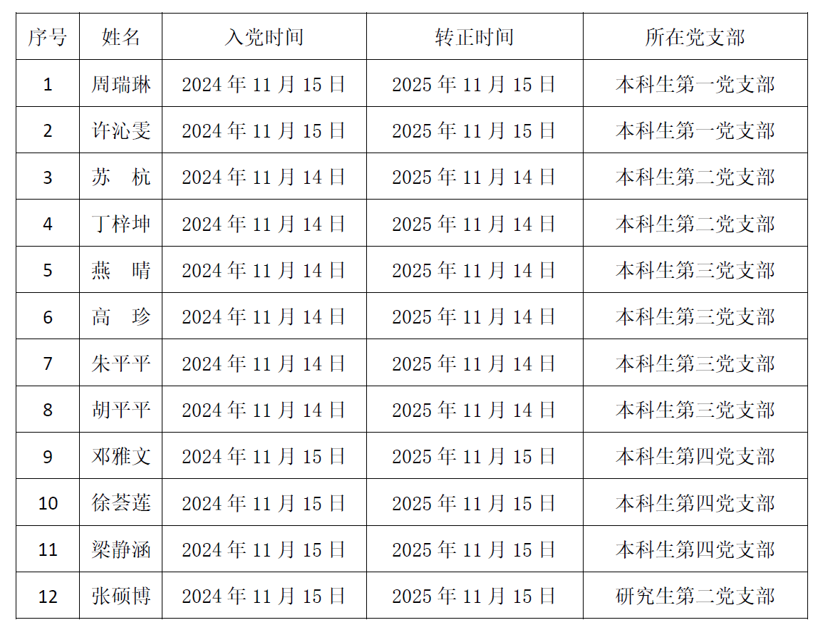 依照《中国共产党章程》《中国共产党发展党员工作细则》精神和《西南大学发展党员工作实施细则》,经本人申请、党支部考察、组织预审,拟于近期讨论以下同志转正事宜,现将基本情况公示如下:
