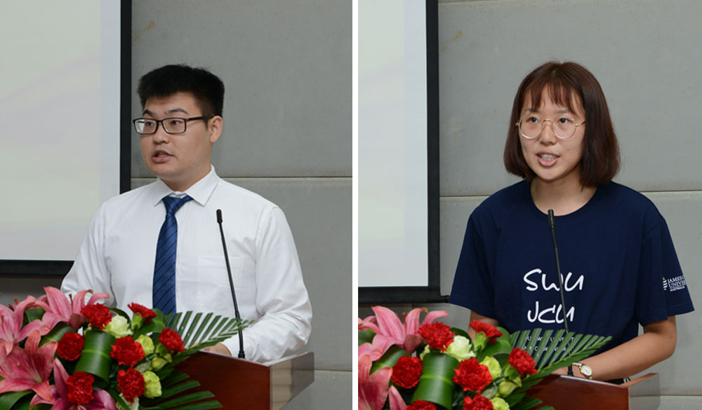 老生代表和新生代表在学院(北碚)新生开学典礼发言