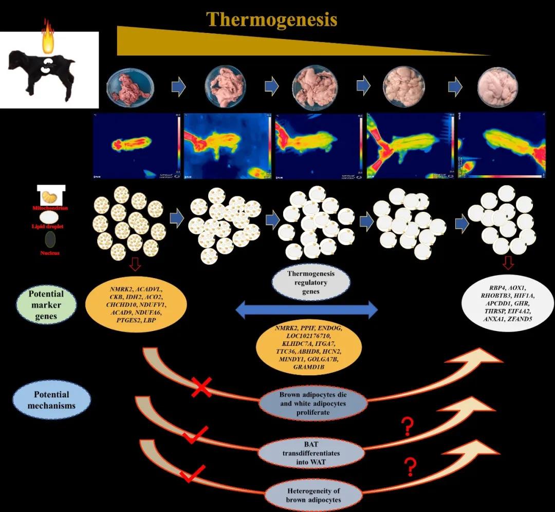 综上,本研究为山羊出生后肾周棕色到白色样脂肪组织的变化提出了新的见解,并结合组学数据,鉴定了一批参与山羊脂肪重塑有关的新基因或信号通路,为进一步研究新生羔羊棕色脂肪产热提供了新靶点。该成果在控制幼畜的死亡率上也有较大的应用潜力。