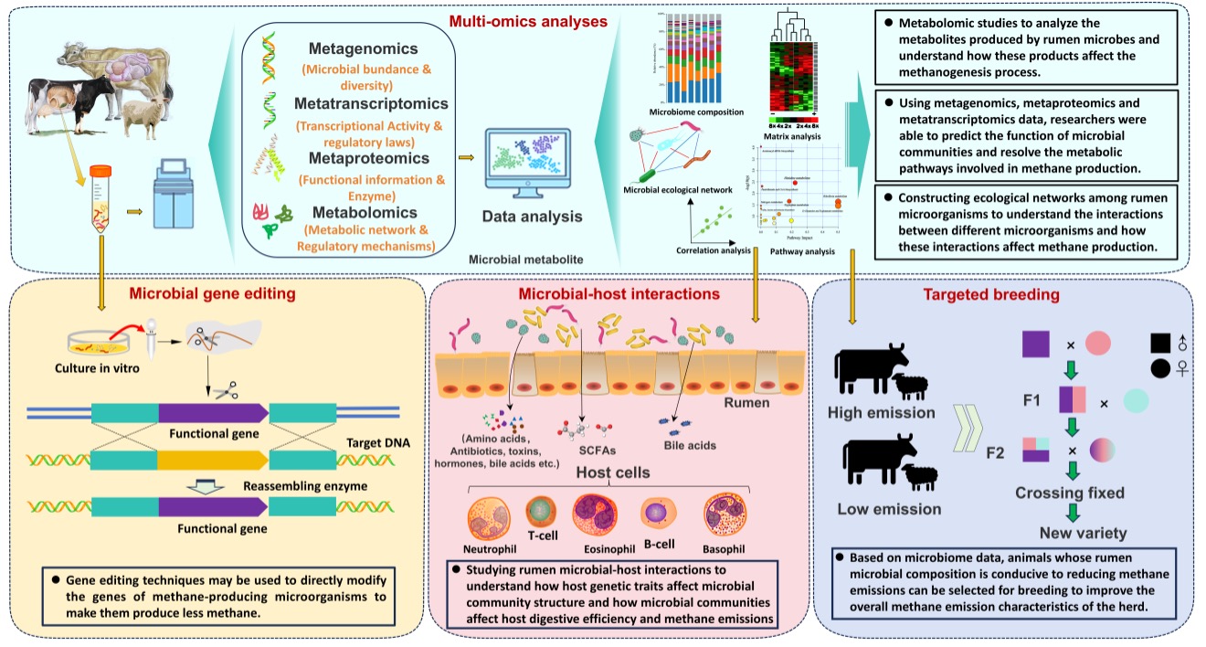 论文提出了未来针对瘤胃微生物 减少甲烷排放的研究趋势,例如:微生物多组学应用、微生物基因编辑、微生物-宿主相互作用的机制及定向育种,为未来定向调控瘤胃微生物组和甲烷代谢途径提供新的抗甲烷策略。这有助于实现畜牧业的可持续发展和环境保护目标。