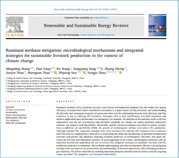 2025年4月11日,西南大学betway88西汉姆联赵永聚教授研究团队在国际顶级TOP期刊 《可再生与可持续能源评论》(Renewable and Sustainable Energy Reviews)正式发表了题为《反刍动物甲烷减排:气候变化背景下可持续畜牧业生产的微生物机制和综合战略》(Ruminant methane mitigation: microbiological mechanisms and integrated strategies for sustainable livestock production in the context of climate change)的论文,系统梳理了反刍动物甲烷减排的微生物学机制及综合调控策略,为草食畜牧业低碳转型绿色发展提供科学依据。